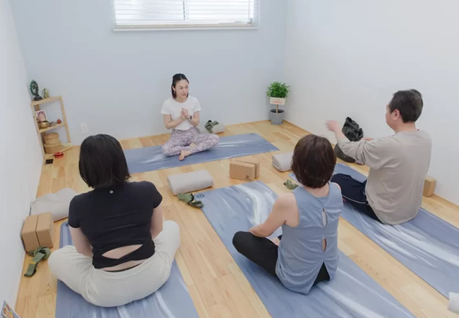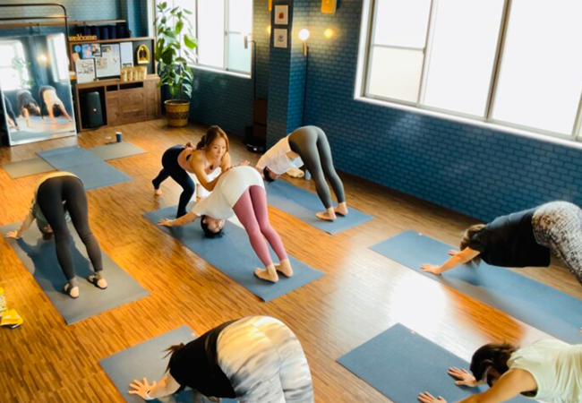クラスは一人ひとりに目が行き届く規模で行われ、日常のセルフケアや心身のバランス調整をテーマに、丁寧な呼吸法ややさしい動きでヨガの基本を中心としたクラス内容が特徴。