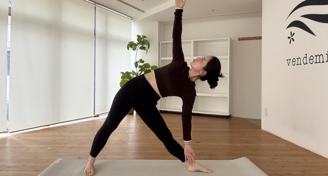 胸の中心から長く両手をひろげて上体を傾ける、トリコナアサナ。