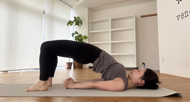 膝を立てた姿勢から、お尻を上にグッと持ち上げて、できそうだったら両手も繋いでしまいましょう!